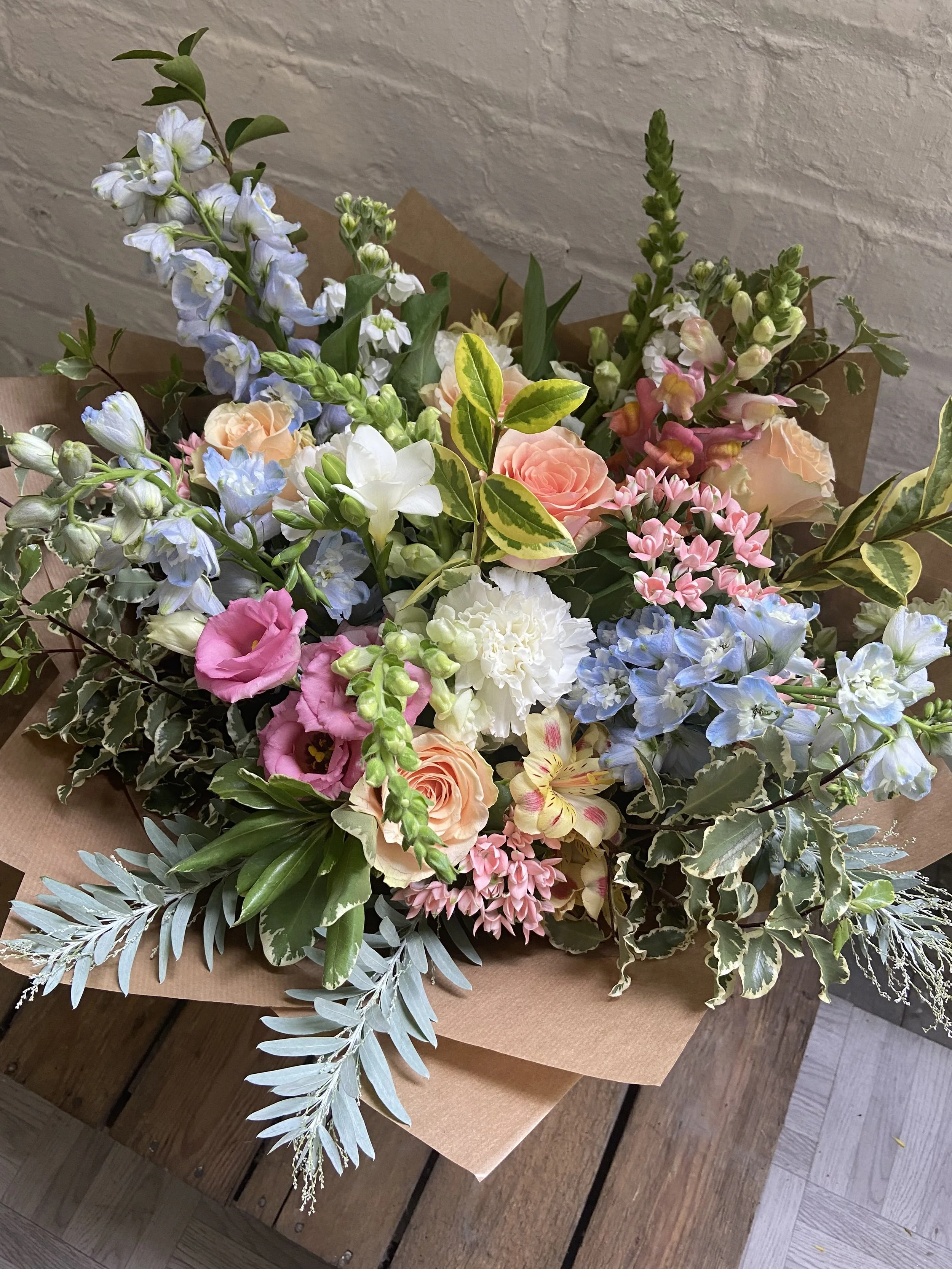 Our Florist’s choice, are made to order with your chosen colour scheme using seasonal flowers and foliage, or premium blooms for luxury options. Prices depend on size and content. If you want an extra-large bouquet, or have a different budget, just let me know.